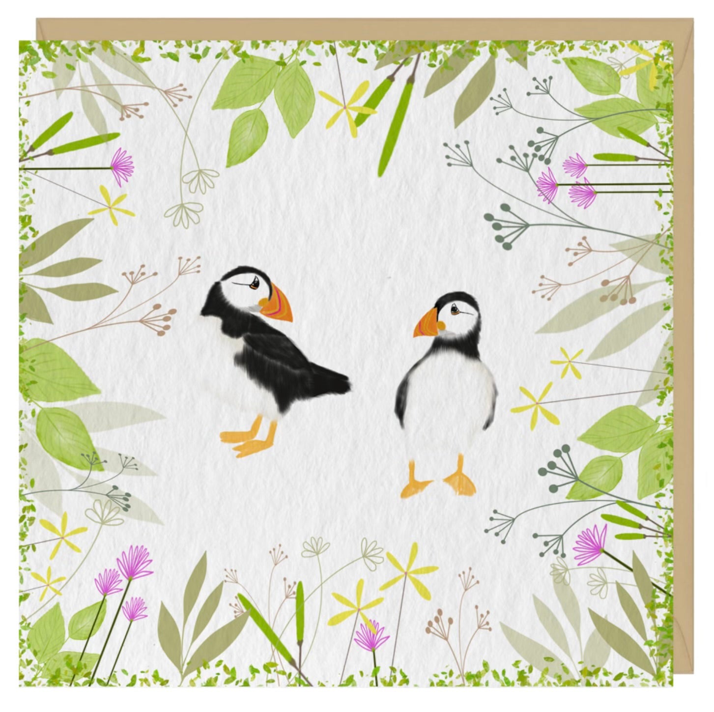 A beautiful card with vibrant colours and two adorable puffins perfect for many different occasions.