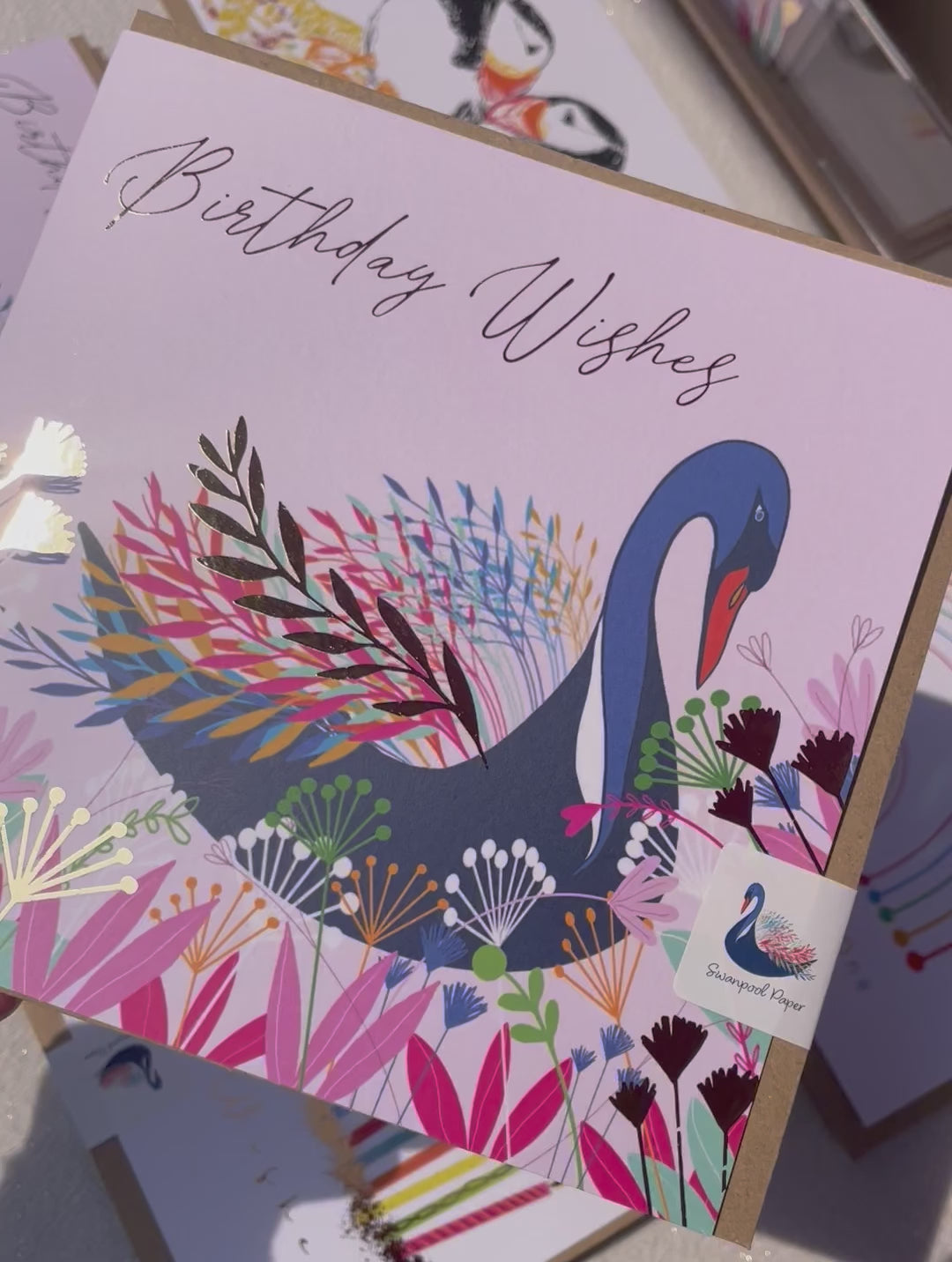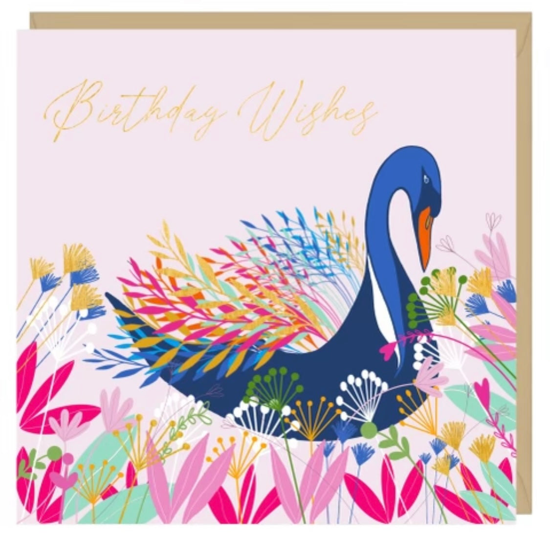 Celebrate a special birthday with our lovely Birthday Wishes Swan Card. This design features our Swanpool Swan surrounded by a vibrant array of bright and colorful florals against a pretty pink background. The elegant gold foil detailing adds a touch of luxury and to this vibrant card.