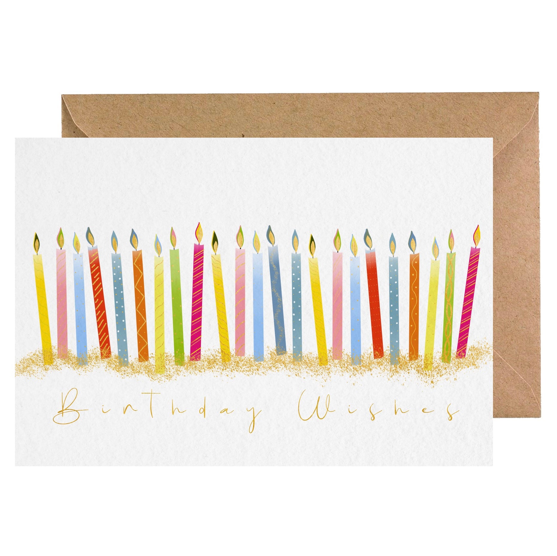 A simplistic but vibrant birthday card featuring delicately decorated, brightly coloured birthday candles with a the luxury addition of gold foil detail to make the card extra special.