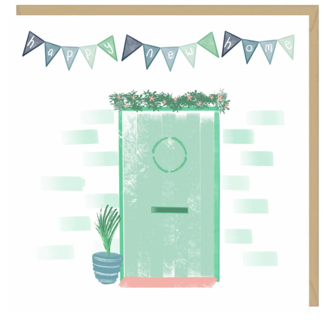 Send your friends or family this lovely card to celebrate their new home, featuring a mint green cottage style door and happy new home bunting.
