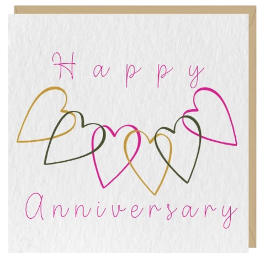 A simplistic design featuring a chain of hand drawn hearts to celebrate a loved one or friends anniversary.