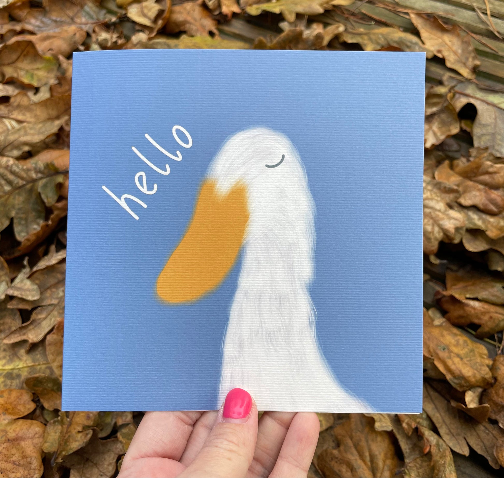 Popping up to say ‘hello’ this card features a fluffy runner duck and the word, ‘hello’